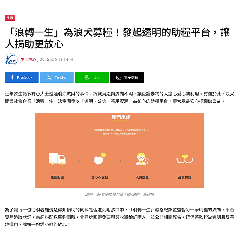 感謝YES新聞網報導!不讓浪犬缺糧挨餓!「浪轉一生」愛心助糧 將營養直送全台狗園
