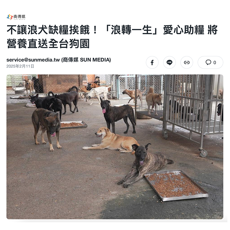感謝 Yahoo新聞網 商傳媒 報導!不讓浪犬缺糧挨餓!「浪轉一生」愛心助糧 將營養直送全台狗園