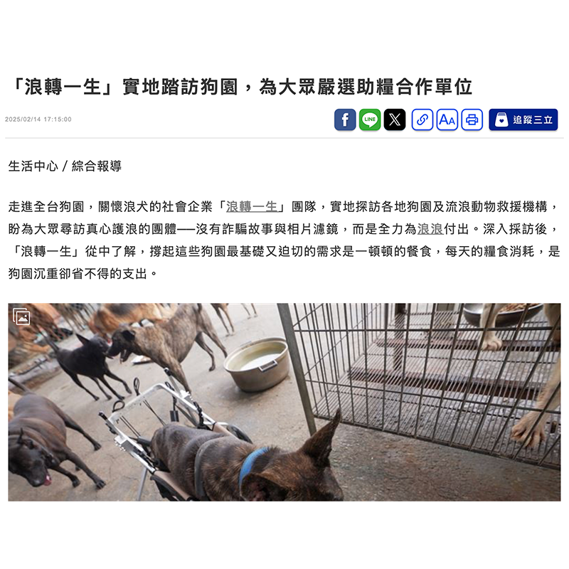 感謝三立新聞網報導!「浪轉一生」實地踏訪狗園,為大眾嚴選助糧合作單位