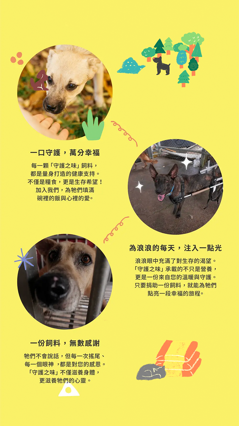 不僅是⼀份飼料,「守護之味」更是為浪浪送上的愛與希望。您的每⼀次選擇,都是對牠們未來的守護與承諾。立即⾏動,為牠們帶來溫暖的⽣活吧!